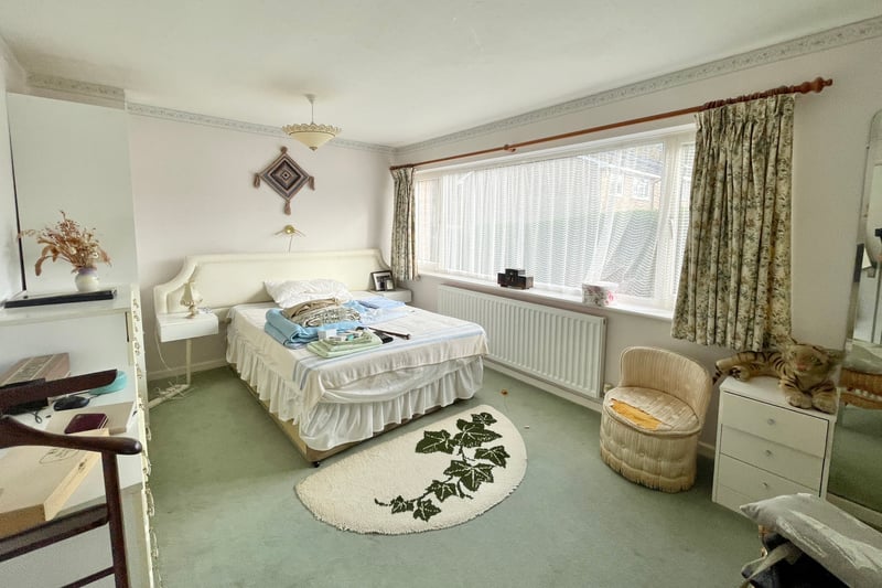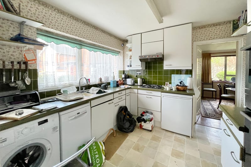 To the front is a driveway and garage and a lawned front garden.